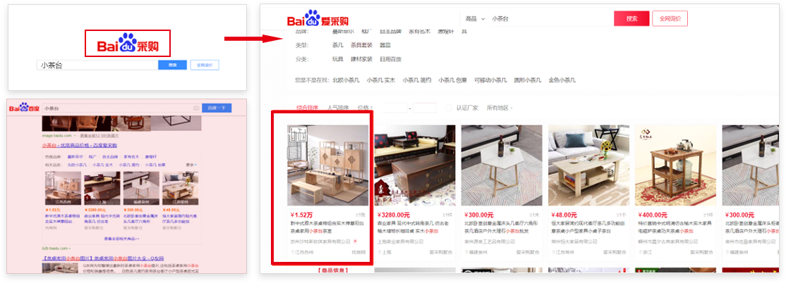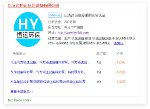 百度采购-流量精准区别于百度大搜(www.baidu.com)内容丰富,百度采购(b2b.baidu.com)通过卡片入口和采购搜索进入,
