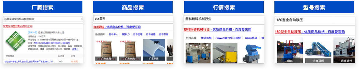 百度爱采购服务高曝光一多场景触发商品搜索、型号搜索、厂家搜索、行情搜索等场景触发展现,遍及各个行业、覆盖各大品类!